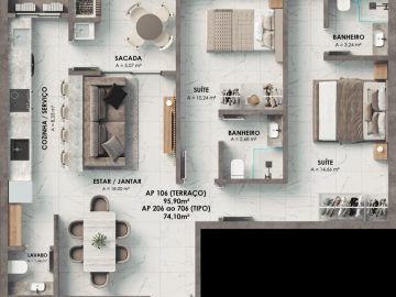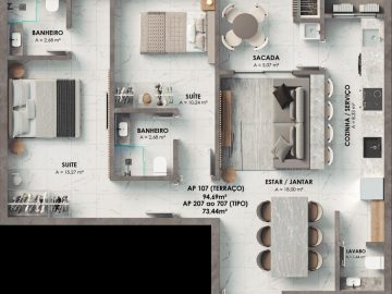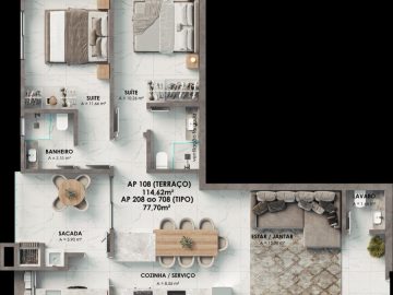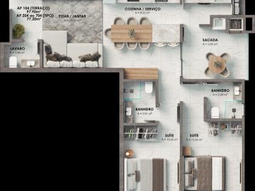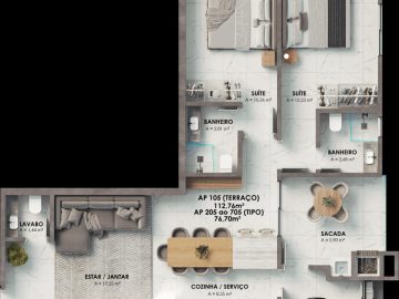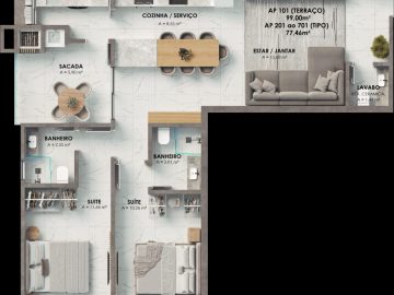 - Plantas de 01 suíte + 01 dormitório ou 02 suítes com ou sem terraço